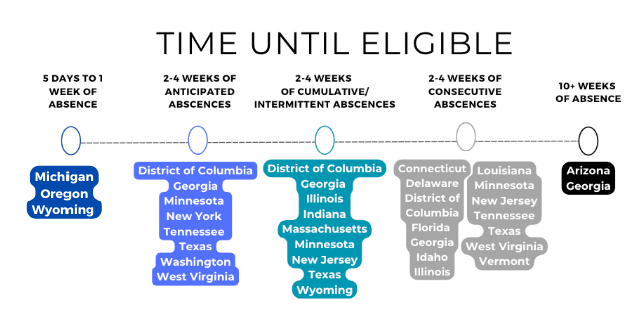 Disclosure: The criteria for eligibility based on time missed can vary between states and may depend on whether the absence is anticipated, consecutive, intermittent, or cumulative. The following map shows where states require a specific duration of absence for eligibility; however, the interpretation can differ based on the terminology used. For example, in Arizona, a student must have three school months of absences, but this can include the cumulative total of intermittent absences.