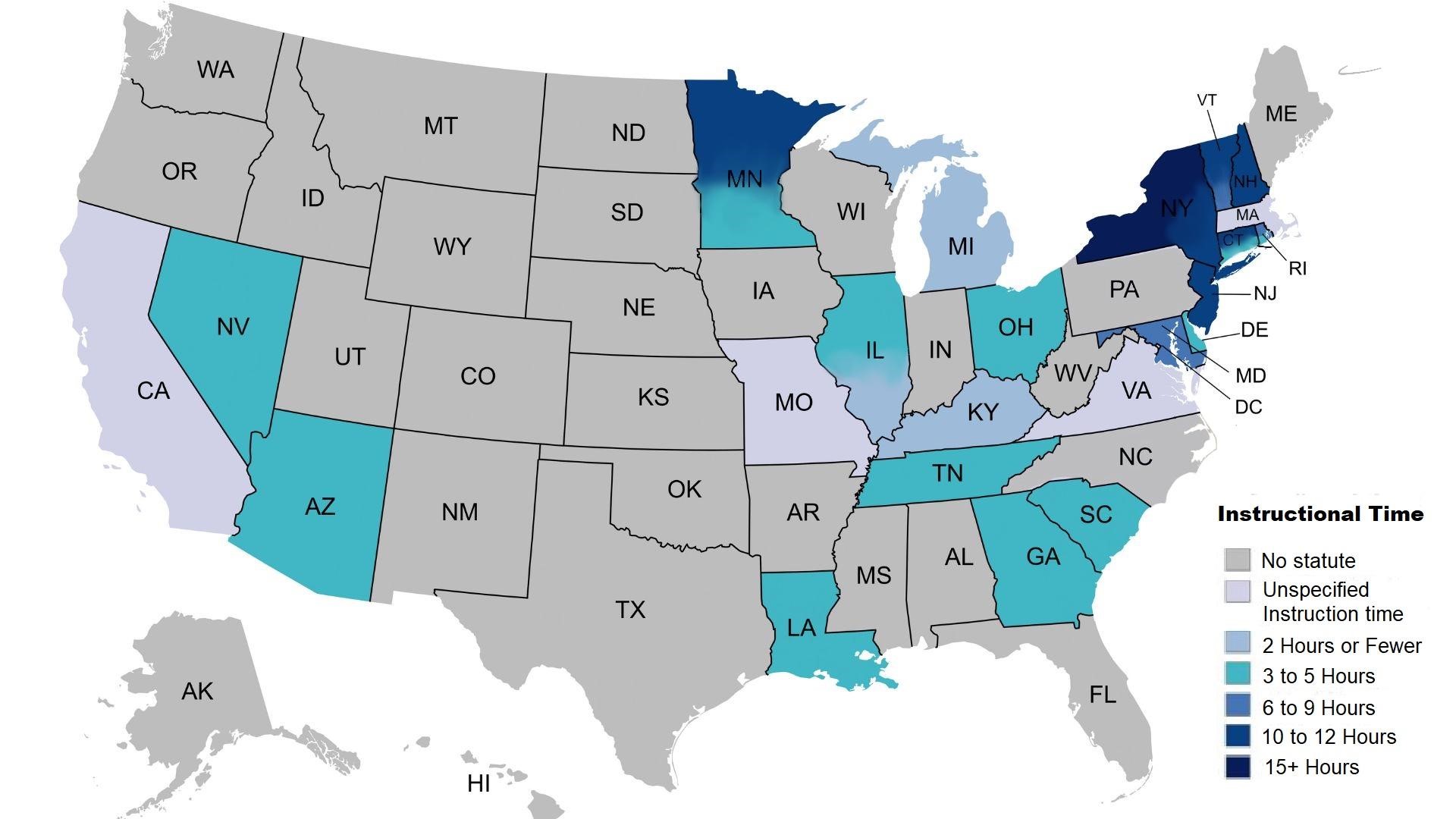 Regarding Instructional time (i.e., hours or amount of time a student who is homebound/hospitalized is entitled to), 26 (51% overall; 65% of coded states/DC) states addressed the requirements for instructional time. Requirements were coded as two or fewer hours per week (3 states) to 10 to 12 hours per week (6 states, 1 with fewer for elementary, 1 with more for secondary, and 1 based on the number of days needing service). The majority of states required between three and five hours of instruction weekly (12 states, 2 with more for secondary; 1 with less if technology is utilized). States employed different methods to calculate instructional time, including minimum hours per day, average hours per day, or a specific number of hours per week. Several states differentiated instructional time based on grade level, Four states did not specify an instructional time minimum, but rather indicated based on students' needs or as indicated in a plan developed by the teacher, school, or the Local Educational Agencies (LEA). Eleven states also explicitly deferred the specific hours based on need or the student’s Individual Educational Plan (IEP). Arizona indicates a minimum of four hours of instruction.