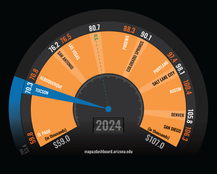 Income gaps are also present within the region. In 2024, the median income for Hispanic households in Tucson was more than $12,000 lower than that of white, non-Hispanic households. Data for the Native Hawaiian and Pacific Islander population were not available for the Tucson MSA in 2024 due to reliability issues.
