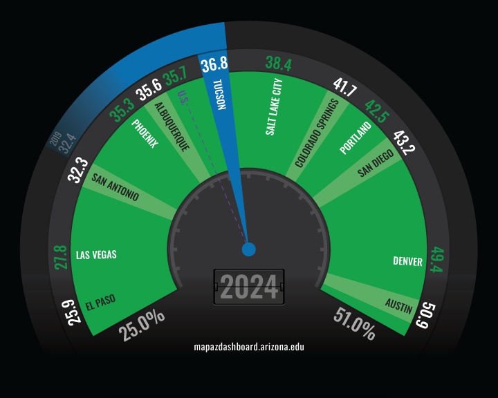 In 2024, the Tucson Metropolitan Statistical Area (MSA) ranked near the middle among 12 peer western MSAs in four-year college attainment. In Tucson, 36.8% of the population age 25 and older had a bachelor’s degree or higher. That share was well below Austin, which ranked first at 50.9%. Since 2019, Tucson’s college attainment rate for the working-age population has increased by 4.4 percentage points, reflecting steady gains across the region.