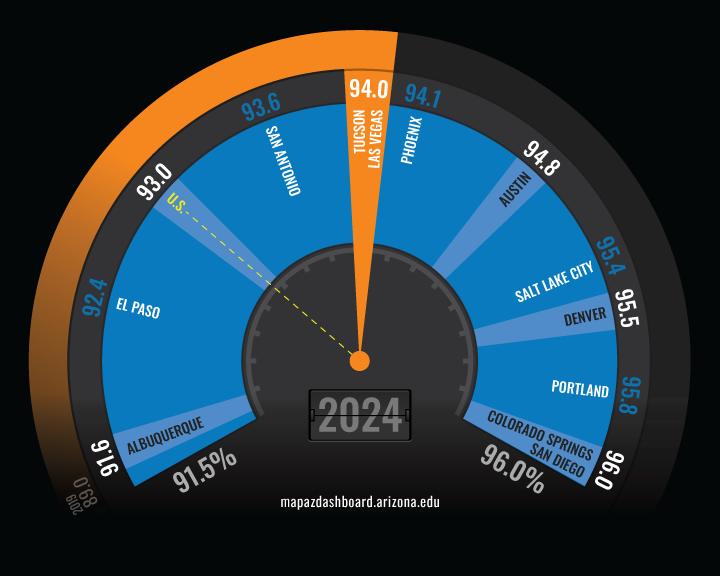 In 2024, 94.0% of households in the Tucson Metropolitan Statistical Area (MSA) had broadband internet access, ranking it eighth and tied with Las Vegas, among the 12 MSAs tracked on the MAP Dashboard. That was a slight decline from Tucson’s previous seventh-place ranking. Among peer MSAs, Albuquerque had the lowest rate at 91.6%, while Colorado Springs and San Diego had the highest at 96.0%. Nationally, 93.0% of U.S. households had broadband internet in 2024, placing Tucson slightly above the national rate.