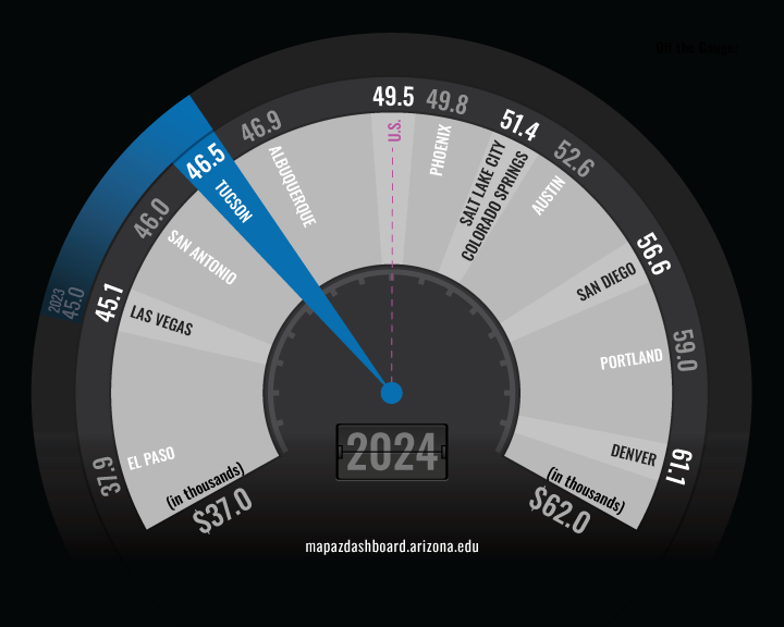Since 2001, the median wage in the Tucson MSA has increased at an average annual rate of 2.9% per year, slightly faster than the national growth rate of 2.7% per year. However, since 2009 (the end of the last recession), Tucson’s median wage has risen slowly, at just 1.9% per year through 2020. In 2021, the median wage in Arizona and Tucson declined by approximately 2.0% from 2020, while the nation’s median wage increased by a whopping 9.1%. Tucson’s decline in median wages was driven in part by a 9.0% drop in the median wage for management occupations, as well as those in the arts, design, entertainment, sports, and media occupations. However, wages rose substantially in 2022 and 2023 for Tucson and Arizona, increasing by 11.5% and 14.7% in 2022 and 6.0% and 5.3% in 2023, respectively. That moved wages in Tucson and Arizona closer to the national median. Tucson’s wage growth in 2024 of 3.2% was in line with the average growth posted over the past two decades of 2.9%.