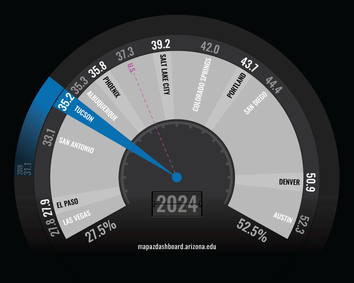 In 2024, 32.4% of working-age men in Tucson had a bachelor’s degree or higher, compared to 37.9% of women. College attainment for both men and women in Tucson remained below the national rate, with a slightly larger gap for women. However, Tucson’s rates for both men and women exceeded the comparable rates in Arizona.
