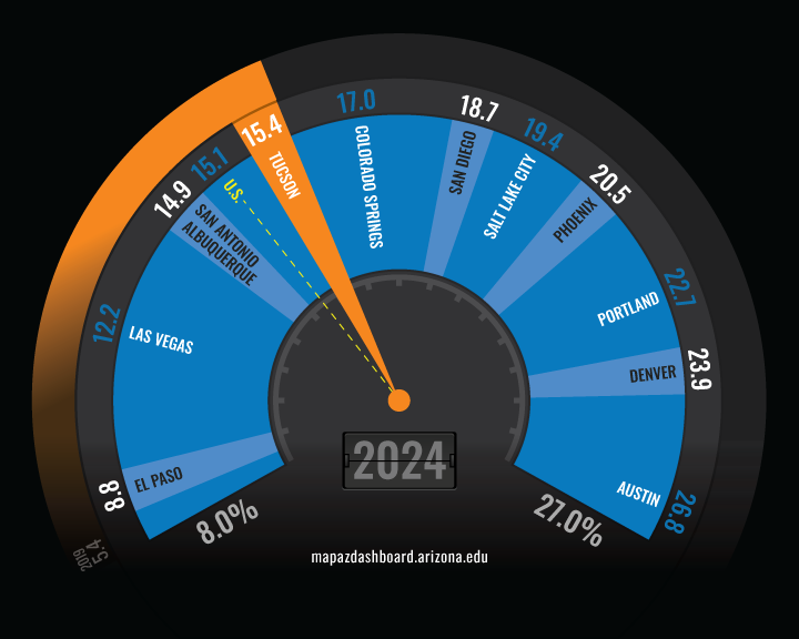 In 2023, 13.8% of residents in the Tucson Metropolitan Statistical Area (MSA) reported working from home. That ranked Tucson eighth among peer western metropolitan areas. Work-from-home rates skyrocketed during the beginning of the pandemic. Rates varied significantly among MSAs depending on the industrial mix and stay-at-home orders. Keep in mind that the data reported here is from a five-year survey therefore it includes one year of data prior to the pandemic.